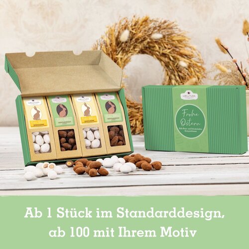 Ab 100 Stück mit Ihrem Etikett im 4c Druck auf dem Deckel des Geschenkkartons, ab 1.000 Stück vollflächig bedruckt im Offsetdruck: Der Geschenkkarton ist portooptimiert und kann ohne Umkarton versendet werden. Beweisen Sie Ihren Geschmackssinn und verschenken Sie eine Oster-Edition der Trüffelmandeln mit Kakao und Kokosmandeln mit weißer Schokolade. Deren perfekte Osterei-Form wird abgerundet mit Oster-Motiven auf der Faltschachtel. Sie suchen eine andere Größe? Dieses Premium Präsent ist auch mit 1, 2 oder 3 Faltschachteln erhältlich.