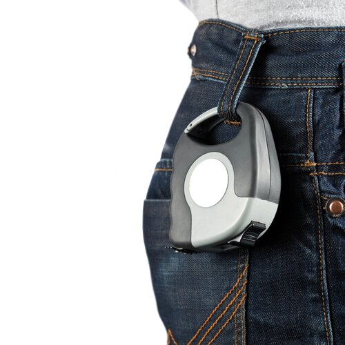 5m/19mm Maßband mit Karabiner, Kunststoffgehäuse in grau, mit schwarzem TPR Griff und Gürtelclip, silbernem Sticker, gelbem Band und 2 starken Magneten.
