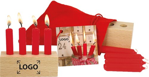 Traditionell werden in der Adventszeit nacheinander 4 Kerzen angezündet. Unser kleiner Adventskranz aus edlem Holz findet überall Platz und kann jedes Jahr wieder verwendet werden. Das Holz strahlt eine wohlige und weihnachtliche Stimmung aus und ist zeitlos im Design. Alles ist schön und praktisch in einem kleinen roten Samtsäckchen verpackt. Platz für den Werbeeindruck ist auf dem Standardmotiv des Anhängekärtchens oder eine eigene Gestaltung des Kärtchens, jeweils bereits ab 250 Stück.