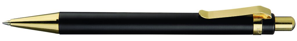 Druckkugelschreiber mit schwarzem oder weißem Gehäuse. Metalldrücker, Metallclip und Metallspitze gold glänzend.