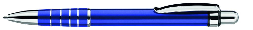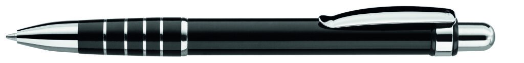 Metall-Druckkugelschreiber mit lackiertem Aluminiumschaft, Metallclip und Griffzone mit Ringdesign glanzverchromt.