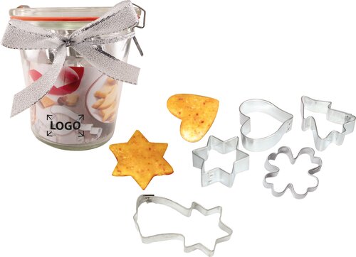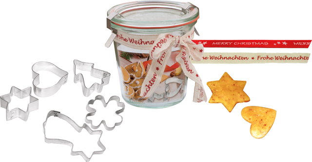 Elegant und absolut praktisch: das Weckglas zum Verschließen mit 5 verschiedenen Ausstechformen (Baum, Herz, Stern, Komet, Kleeblatt) für die Weihnachtsbäckerei. So können die Ausstechformen geschützt aufbewahrt werden. Platz für den Werbedruck ist auf dem Standardmotiv des Einlegers oder eine eigene estaltung, jeweils ab 100 Stück.