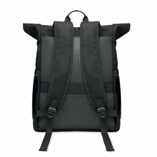 Rolltop-Rucksack aus PU-beschichtetem 600D RPET-Polyester und RPET-Polyesterfutter. 15'' Laptop-Fach. Gepolsterter Netzrücken mit Reißverschlusstasche und Trolley-Halterung. Gepolsterte Schultergurte mit Mesh-Finish-Innenseite.