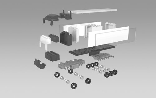 Bausatz Sattelschlepper, o h n e Spielfeld bestehend aus 36 Bauteilen aus denen ein Sattelschlepper zusammengesteckt wird. Schachtel individuell gestaltet. Optional 4c bedruckter Papiereinleger hinter glasklarem Kunststoff auf die 2 LKW Seitenwände.