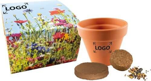 Ihr Werbegeschenk als Beitrag für eine bienenfreundliche Umwelt. In diesem schönen Tontopf kann eine Bienenwiese wachsen. Ein Werbeeindruck oder eine individuelle Gestaltung der Banderole ist bereits ab 250 Stück möglich.