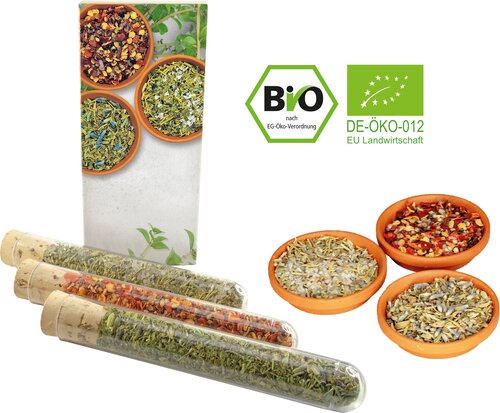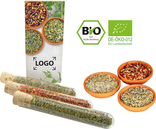 Ein dreifaches Hoch auf unsere BIO-Kräuter! r Ihre Werbebotschaft mit Bio-Qualität. Die Packung kann ab 250 Stück mit Ihrem Logo versehen oder individuell gestaltet werden.