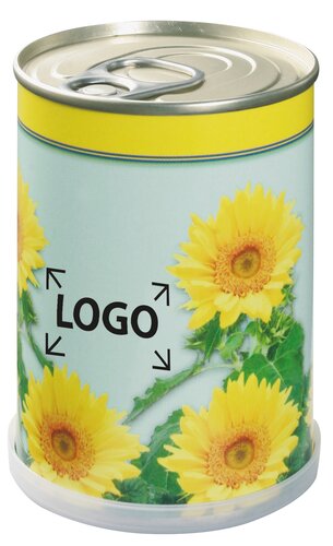 Das Getränkedosenformat mit Wachstum. Aufreißdeckel öffnen. Den Deckel als Untersetzer einsetzen und über den Boden stülpen. Die Standardgrafik bietet Platz für einen Aufdruck im Tampondruckverfahren. Eine komplett eigene Gestaltung der Dose und Samenwahl bereits ab 5.000 Stück.