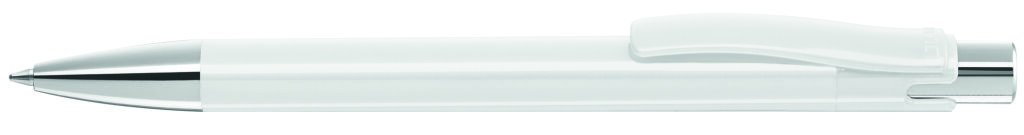 Druckkugelschreiber mit gedeckt glänzendem Gehäuse, Metalldrücker und schwerer Metallspitze glanzverchromt.