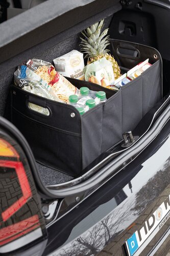 Kofferraumtasche CAR-GADGET, faltbar: 2 Fächer mit Einlegeboden für viel Stauraum sowie ein Netzeinsteckfach, 2 integrierte Tragegriffe, mit Klettverschluss am Boden für besten Halt im Kofferraum sowie 4 Metall-Befestigungsösen – bei Nichtgebrauch durch elastischen Gurt platzsparend faltbar