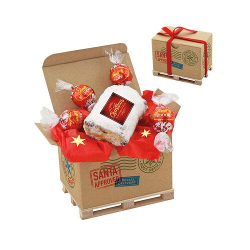 1 origineller Palettencontainer aus Karton mit 4c Standardmotiv "Santa Approved - Special Delivery" mit Schleifenband auf einer Minipalette aus Echtholz, gefüllt mit: 1 Gourmet-Christstollen 80 g und 4 zartschmezende Lindor Kugeln Lindt, je 12,5 g. • Die praktische Cargo-Box kann mit einem Druck 4c, Druck 1c, Etikett 4c, Anhänger 4c und ab 3000 Stück mit einem 4c All-Over Druck individualisiert werden. Zusätzlich kann auch die Mini-Holz-Palette mit einem 1c Druck veredelt werden. Lebensmittel-Infos: Lindt Lindorkugel Vollmilch 12,5g: Zucker, pflanzliches Fett (Kokosnuss, Palmkern), Kakaobutter, Vollmilchpulver, Kakaomasse, Milchzucker, BUTTER reinfett, Magermilchpulver, Emulgator ( SOJA lecithin), Gerstenmalzextrakt, Aromen. Kann HASELNÜSSE und MANDEL n enthalten, Mini-Gourmet-Stollen Merry Christmas: WEIZEN mehl, 12% Rosinen, Zucker, Dextrose, MANDELN, BUTTER reinfett, Palmfett*, Glukose-Fruktose-Sirup, Rapsöl, WEIZEN stärke, Feuchthaltemittel: Sorbit; Orangenschalen, Zitronenschalen, Hefe, Salz, natürliches Aroma, Emulgatoren: Mono- und Diglyceride von Speisefettsäuren, Natriumstearoyl-2-lactylat; ganz gehärtetes Palmfett*. (*zertifiziertes nachhaltiges Palmöl). Durchschnittliche Nährwerte pro 100 g: Lindt Lindorkugel Vollmilch 12,5g: Energie: 2587 kJ/623 kcal, Fett: 47 g, davon gesättigte Fettsäuren 34 g, Kohlenhydrate: 44 g, davon Zucker 42 g, Eiweiß: 5,0 g, Salz: 0,17 g, Gourmet-Christstollen 80 g.: Energie: 1806 kJ/432 kcal, Fett: 21 g, davon gesättigte Fettsäuren 8,9 g, Kohlenhydrate: 55 g, davon Zucker 31 g, Eiweiß: 4,8 g, Salz: 0,63 g. Allergene: Lindt Lindorkugel Vollmilch 12,5g: Milcheiweiß, Milchzucker, Soja, Gerste. Kann Haselnüsse und MANDELN enthalten, Mini-Gourmet-Stollen Merry Christmas: Weizen (glutenhaltiges Getreide). Kann Spuren von Haselnüssen, Walnüssen, Eiern, Erdnüssen, Schalenfrüchten, MANDELN und Milcherzeugnisse (einschließlich Lactose) enthalten.