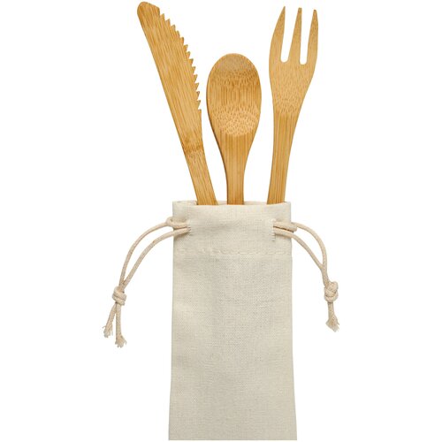 Besteckset aus Bambus, bestehend aus Gabel, Messer und Löffel. Wird in einem Vliesbeutel geliefert.
