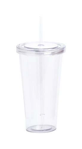 Farbig transparenter Trinkbecher aus Kunststoff mit Trinkhalm. Füllmenge: 750 ml.