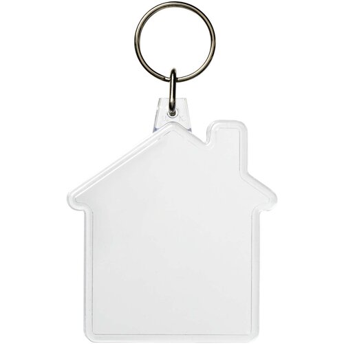 Transparenter Schlüsselanhänger in Hausform mit metallenem Schlüsselring. Der Metallring bietet ein flaches Profil, das sich ideal für Mailings eignet. Abmessungen der Druckeinlage: 5,9 cm x 5,6 cm.