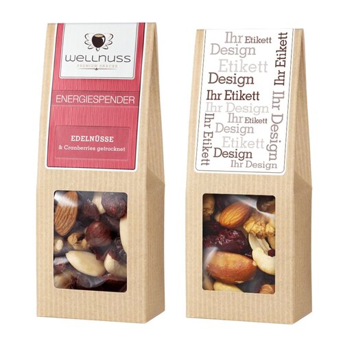 Ab 250 Stück mit Ihrem Motiv im 4c Druck auf dem Etikett der Faltschachtel, ab 2.500 Stück bedrucken wir den Faltschachtelkarton vollflächig: Der aufmerksamkeitsstarke Bestseller. Die Faltschachtel als nachhaltiges Premium-Giveaway. Süßliche Cashews, herbe Mandeln und aromatische Walnüsse spielen mit der leichten Säure schonend getrockneter Cranberries. Diese Snack-Komposition ist vegan, laktosefrei und glutenfrei.