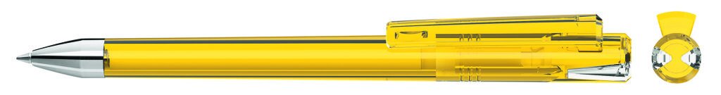 Drehkugelschreiber mit transparent glänzendem Gehäuse und Oberteil mit zwei farbigen Stopfen in gedeckt oder transparent glänzend. Schwere Metallspitze glanzverchromt.