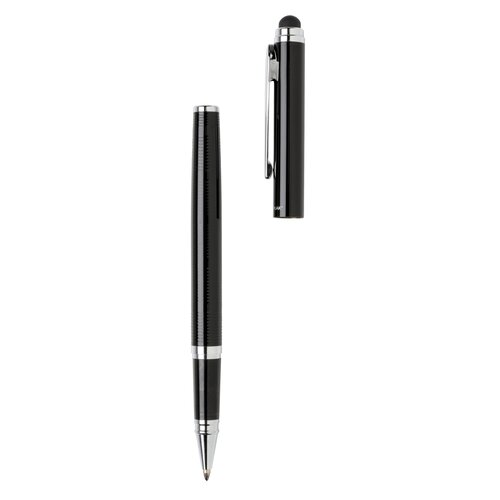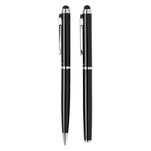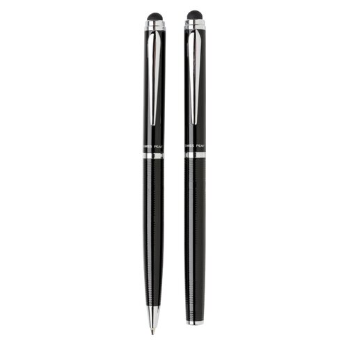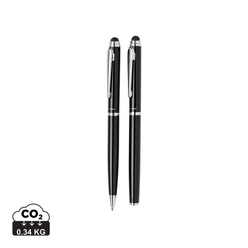 Ein Set aus Stylus Kugelschreiber und Stylus Rollerball mit wunderschönen feinen Linien am Schaft und einem besonderen Platz für Ihr Logo. Blauschreibend. Inklusive Swiss Peak Röhren-Geschenkverpackung.