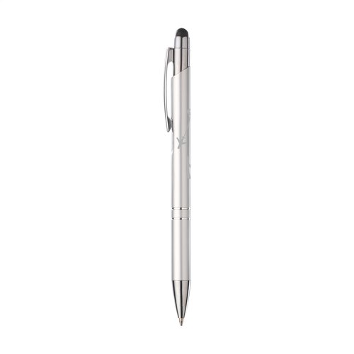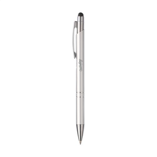 Blauschreibender Kugelschreiber mit Aluminiumgehäuse, gummierte Spitze zum Bedienen von Touchscreens (wie iPhone/iPad), mattfarbenes Metallgehäuse und Metallclip/-druckknopf.