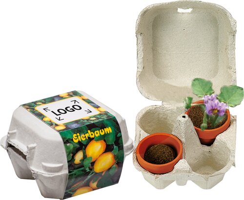 Überreichen Sie ein Stück Natur. Die Box in den Abmessungen 110 x 110 x 80 mm bietet mit der umlaufenden Banderole Platz für Ihren Werbeeindruck. Zwei Tontöpfchen, mit Eierbaumsamen bestückt, bringen österliches Wachstum.