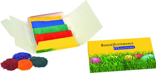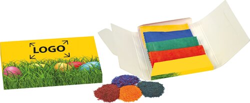 Zaubern Sie farbenfrohe Eier zu Ostern mit unseren neuen Farbpulvern. Vier verschiedene Farben (rot, blau, grün und gelb) sind im Päckchen enthalten. Die einfache Handhabung ist auf dem Päckchen aufgedruckt. Der Werbeeindruck ab 250 Stück erfolgt auf dem Standardmotiv. Eine eigene Gestaltung des Päckchens ist ebenfalls ab 250 Stück möglich.
