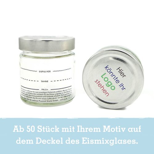 Ab 100 Stück mit Ihrem Motiv auf dem Deckel des Mixglases: Mit dem Eismixglas, der "kleinsten Eismaschine der Welt", und dem Premium Eispulver verschenken Sie den perfekten Sommermoment für Zuhause mit Langzeitwebeeffekt. Wählen Sie aus den Sorten "Schoko Deluxe" und "Vanille Royal". Dieser Artikel ist vegan, laktosefrei und glutenfrei und kann auch mit Milchersatzprodukten zubereitet werden.