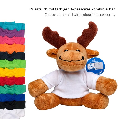 Unsere Zootier-Serie hat sich zu einem Bestseller innerhalb der MiniFeet® Familie entwickelt. Aus diesem Grund wurde die Zootier-Familie vom TÜV Rheinland auf Herz und Nieren geprüft. Nun dürfen wir voller Stolz mitteilen, dass die wilden Kuschelkumpel den Toy Proof Kriterienkatalog für Spielzeuge erfüllen. Die großen Kulleraugen und der schmuseweiche Plüsch laden zu gemütlichen Kuschelzeiten ein. Die Werbeanbringung erfolgt auf den passenden Accessoires wie Dreieckstuch oder Doming. Unser kleiner Elch Emil sitzt breit grinsend da und lädt so zum Kuscheln ein. Sein karamellbraunes Fell steht im Kontrast zu seinem dunkleren Löffelgeweih und gibt ihm so ein typisches Aussehen, das an weite Wälder und schönes Schmusen denken lässt.