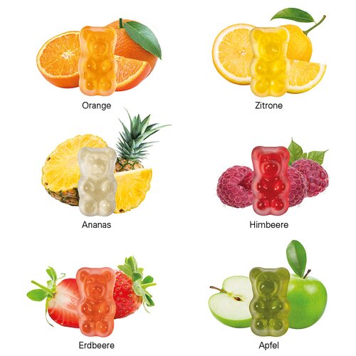 Gummibärchen in Tüte aus weißer oder transparenter Folie, Folie individuell bedruckt., Mindesthaltbarkeit 12 Monate, Pflichtangaben: http://declarations.de/?c91f949334cada26=9873b24a7b85feff&locale=de_DE&artnr=67267