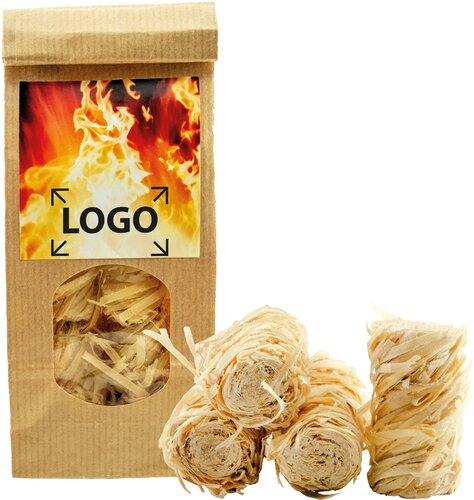 Diese sicheren und umweltfreundlichen Anzündhilfen aus gewachster Holzwolle erleichtern das Anzünden des Kamins oder auch des Grills. Das Standardmotiv des Etiketts bietet ausreichend Platz für Ihre Werbeanbringung. Eine individuelle Gestaltung ist ebenfalls ab 250 Stück möglich.