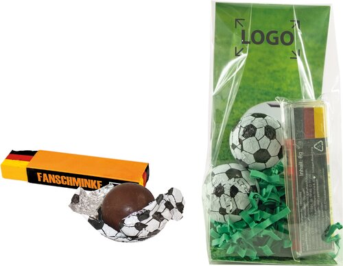 Das lässt das Fan-Herz höherschlagen. Fan-Schminke und leckere Schokofußbälle in einer transparenten Tüte. Der großzügige Werbeträger bietet viel Platz für Ihr Logo. Auch eine eigene Gestaltung der Karte ist ab 250 Stück möglich.