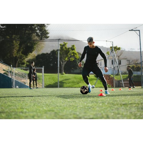 Tore schießen wie ein Champion! Maschinell genähter Fußball aus PVC in glänzendem schwarz mit aufgedruckten Sternen in gold und weiß. Größe 5. Der Ball in Größe 5 ist 3-lagig und hat 32 Panele. Er verfügt über eine Dicke von 1,6 mm, ein Butyl-Ventil und eine Latex-Blase.