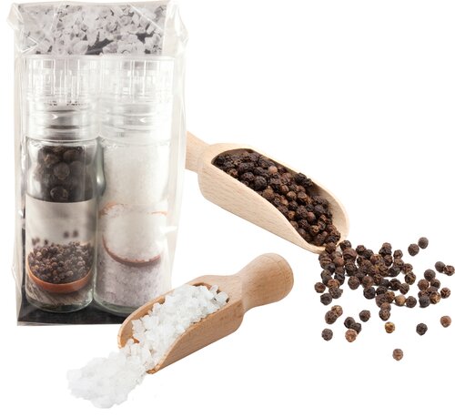 Ein feines Präsent für jeden Gourmet. Zwei kleine Mühlen aus Glas aus europäischer Produktion. Grobes Meersalz und Pfefferkörner lassen sich damit problemlos zerkleinern. Das Wiederauffüllen, auch mit anderen Gewürzen, sorgt für Nachhaltigkeit. Der Einlege kann ab 250 Stück mit Ihrem Logo versehen oder individuell gestaltet werden.