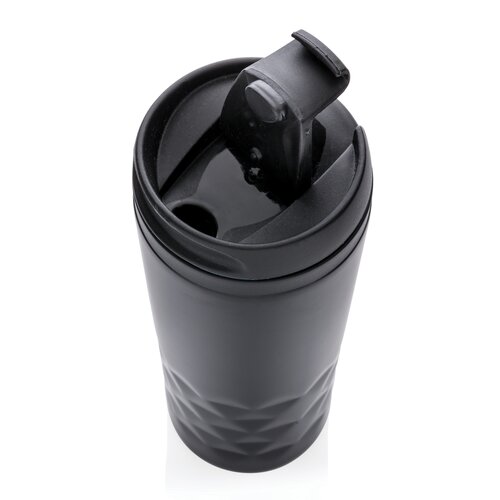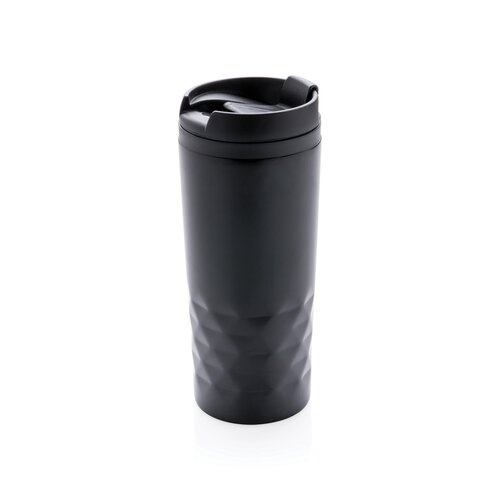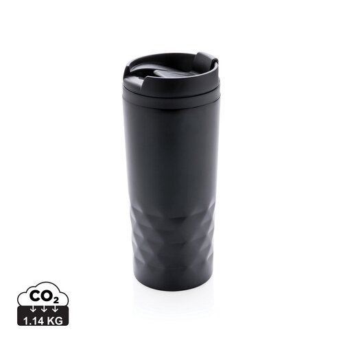 Modischer Stainless-Steel Becher mit geometrischen Details. Innen aus PP. Nur Handwäsche. Inhalt: 300ml. Nur Handwäsche.