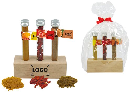Ein perfektes Gewürz-Trio für die leichte indische und asiatische Küche. In einem Ständer aus Holz können die Reagenzgläser griffbereit in der Küche platziert werden. Hierbei kann das Logo nachhaltig im Tampondruck direkt auf dem Holzständer angebracht werden. Platz für den Werbedruck ist auf den Standardmotiven der Fähnchen oder eine eigene Gestaltung, jeweils bereits ab 100 Stück.
