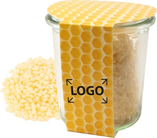 Ein Weckglas gefüllt mit 100% reinem Bienenwachs. Eine natürliche und nachhaltige Werbebotschaft, die bei Ihren Kunden in Erinnerung bleibt. Nach dem Abbrennen kann das Weckglas auch für andere Inhalte verwendet werden. Ab 250 Stück kann die Banderole mit Ihrem Eindruck versehen oder individuell gestaltet werden.
