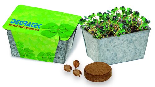 Metallic, modern, der kleine Zinkbehälter für die Anzucht Ihrer wachsenden Grüße. Eingelegt in das Wachstums-Kästchen sind Erdtablette und Glückskleezwiebelchen. Die umlaufende Banderole bietet Platz für Ihre Werbebotschaft ab 250 Stück. Eine eigene Gestaltung der Banderole ist ebenfalls ab 250 Stück realisierbar.