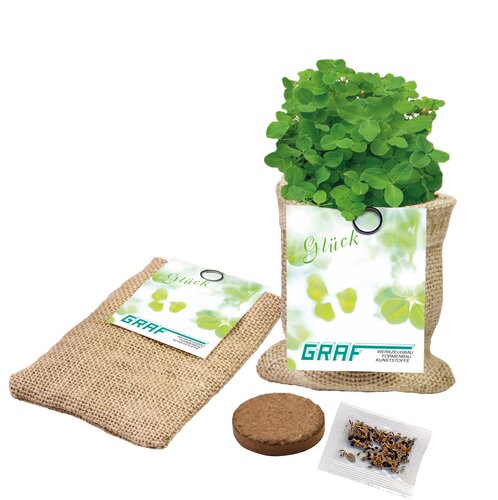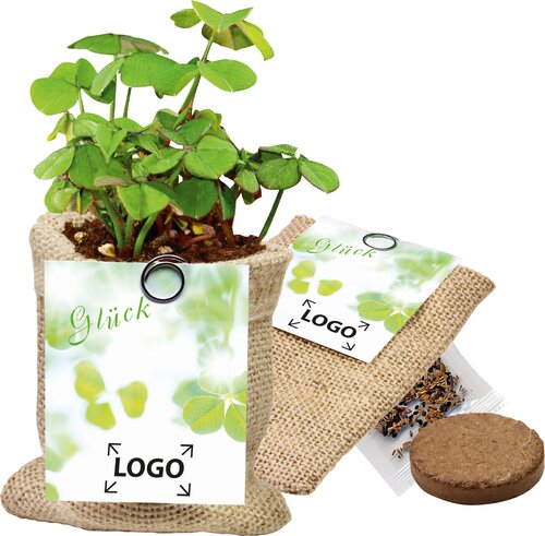 Ein Glücksbringer mit dem Natursäckchen. Suchen Sie Ihr Glück aus dem Jutesäckchen. Die Handhabung ist auf dem Kärtchen zu finden. Ein flacher Naturartikel, der durch das Wachstum zum Pflanzbeutel wird. Mit dem Kärtchen die Werbebotschaft auf der Vorderseite anheften, dadurch ist sie ständig im Blickfeld. Platz für Ihren Eindruck ist auf dem Standardmotiv oder alternativ Ihre eigene Gestaltung des Kärtchens, jeweils ab 250 Stück.