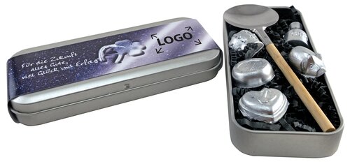Mit den Glücksfiguren aus Wachs lässt sich vielleicht deuten, was die Zukunft bringen könnte. Ein sympathisches und nicht alltägliches Giveaway für Ihre Kunden zum Jahresende. Die Standardbanderole bietet genug Platz für Ihre Werbebotschaft. Eine eigene Gestaltung ist ebenfalls ab 100 Stück möglich.