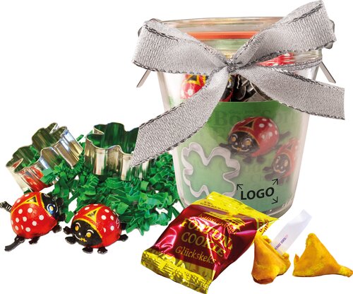 Das Glücksglas garantiert einen sympathischen Jahresabschluss und einen gelungenen Start in das Neue Jahr. Das Weckglas enthält einen Glückskeks, 2 Ausstechformen Kleeblatt und 2 Glückskäfer aus Schokolade. Platz für den Werbedruck ist auf dem Standardmotiv des Einlegers oder eine eigene Gestaltung, jeweils ab 100 Stück.
