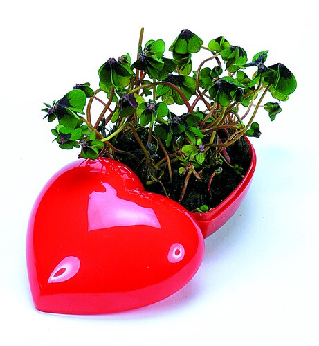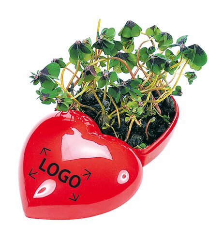 Ein ansprechendes rotes Herz aus Kuststoff, der Klassiker für den Schreibtisch oder die Fensterbank. Einfach die Zwiebeln nach Anleitung im Unterteil des Herzens einpflanzen. Die Glücksbotschaft mit echtem vierblättrigem Glücksklee wächst schon nach kurzer Zeit heran. Platz für den Werbedruck (ab 100 Stück) ist auf dem Deckel als Tampondruck.