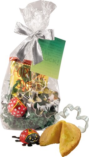 Diese Glücksbringer sind genau das Richtige für Ihre Kunden: Ein Glückskäfer aus Schokolade, ein Glückskeks und ein Ausstechförmchen Glücksklee. Das Anhängekärtchen bietet genug Platz für Ihre Werbeanbringung. Eine individuelle Gestaltung ist ebenfalls ab 250 Stück möglich.