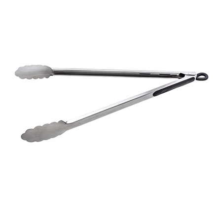 Die Edelstahl-Grillzange kann über Ziehen der Schlaufe am Kopf verriegelt oder geöffnet werden.