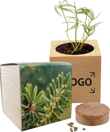 Ein nachhaltiger und naturiger Werbeträger für Ihre Aktion. Mit dem eingelegten Becher, der Erdtablette und den Samen der Fichte ist der Holzwürfel ein attraktiver Blickfänger auf dem Schreibtisch. Der Werbedruck erfolgt auf der Banderole oder direkt auf dem Holzwürfel. Eine eigene Gestaltung der Banderole ist bereits ab 250 Stück möglich.