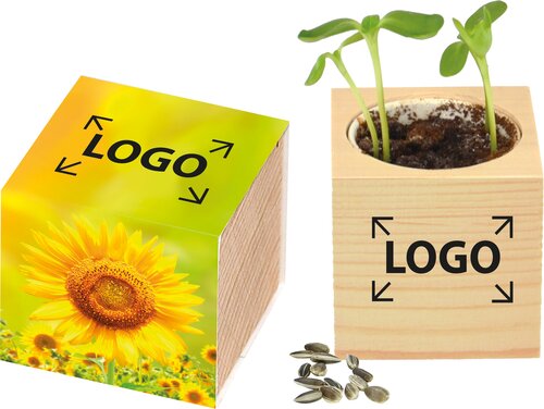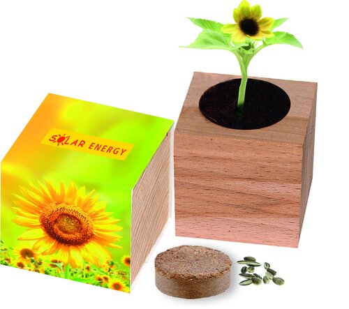 Ein nachhaltiger und naturiger Werbeträger für Ihre Aktion. Mit dem eingelegten Becher, der Erdtablette und den Samen der Zwergsonnenblume ist der Holzwürfel ein attraktiver Blickfänger auf dem Schreibtisch. Der Werbedruck erfolgt auf der Banderole oder direkt auf dem Holzwürfel. Eine eigene Gestaltung der Banderole ist bereits ab 250 Stück möglich.