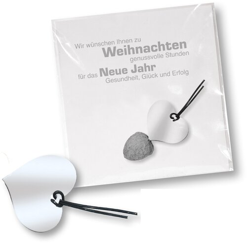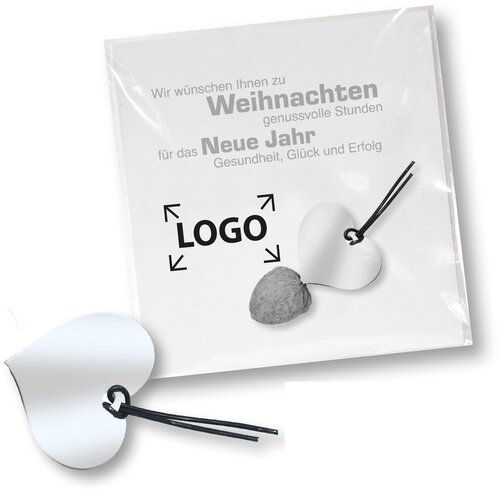Ein nützliches Design-Objekt für den täglichen Gebrauch. In der Winterzeit und zu Weihnachten kommt dieser Nussknacker aus Edelstahl zum Einsatz. Zusammen mit einem Grußkärtchen ist dieser Artikel praktisch in einer Tüte verpackt (ohne Nuss). Platz für die Werbefläche ist auf dem Standdardmotiv des Kärtchens oder eine eigene Gestaltung, jeweils ab 250 Stück.