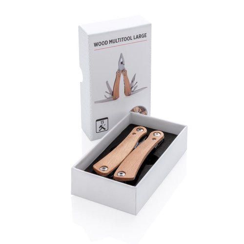 Multitool mit Buchengriff. 13 Funktionen aus Edelstahl wie eine Feile, Zange, Messer, Schraubendreher, Säge, Dosenöffner und vielem mehr. In Geschenkbox verpackt.