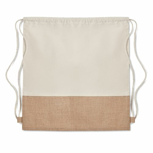 Beutel mit Kordelzug und Besatz aus Jute. Lange Tragegriffe. 160 g/m².