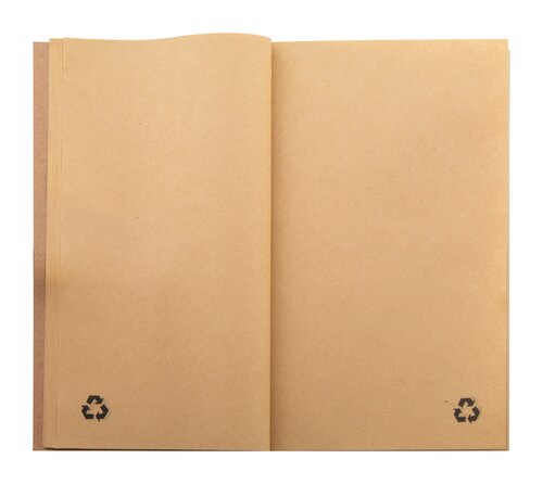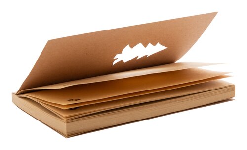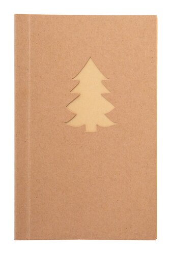 Notizbuch mit Recyclingpapiereinband, gestanztem Weihnachtsbaum auf dem Einband und 85 weißen Blättern aus recyceltem Kraftpapier.