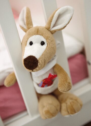 Plüsch-Känguru JUMPER: mit weichem Fell, Bauchtasche und Halstuch (separat gepackt) zum Bedrucken