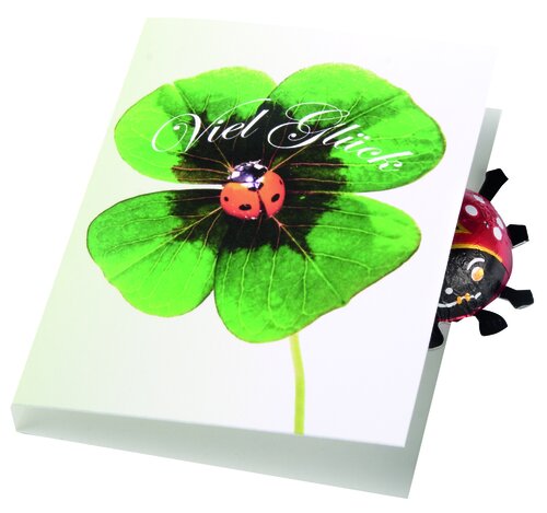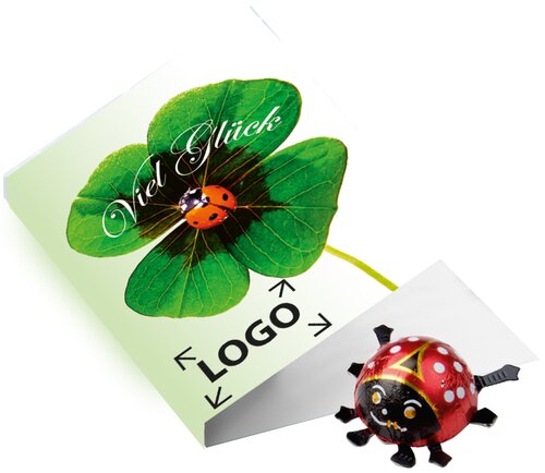 Nicht nur zu Silvester, sondern das ganze Jahr über wird Glück benötigt. Dieses Klappkärtchen enthält einen Glückskäfer (6 g) aus Vollmilch-Schokolade. Platz für den Werbedruck ist auf dem Standardmotiv der Karte oder eine eigene Gestaltung, jeweils ab 250 Stück.
