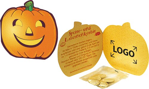 Ende Oktober, wenn die Ernte eingefahren ist, gibt es die besondere Möglichkeit zu danken. Ein Kult aus früherer Zeit, der jetzt Europa erobert hat. Sagen Sie auch Danke zu Ihren Geschäftspartnern. Dieses Klappkärtchen als Giveaway zum Überreichen mit Kürbiskernen für die Aussaat Ihres eigenen Kürbisses für das nächste Fest. Werbefläche bietet die Innenseite der Karte auf dem Standardmotiv oder eine eigene Gestaltung, jeweils ab 500 Stück.