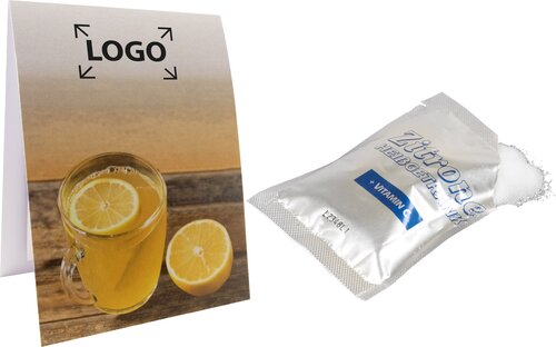 Nach einem Spaziergang im Schnee oder um einer Erkältung in der kalten Jahreszeit vorzubeugen ist ein Glas heiße Zitrone genau das Richtige. Schnell und unkompliziert mit heißem Wasser angerührt. Für Ihren Werbeeindruck gibt es ausreichend Platz auf dem Standardmotiv der Karte oder, ebenfalls ab 250 Stück, für eine eigene Gestaltung.